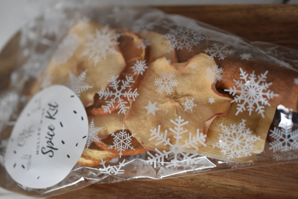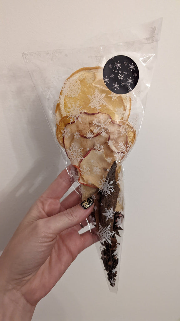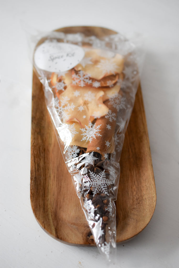 Individually packaged mulled wines spice kits - include a mix of spices, dried organic fruit slices and demerara sugar. Add to red wine, cider or apple juice and warm before serving. Plus your house will smell so festive!